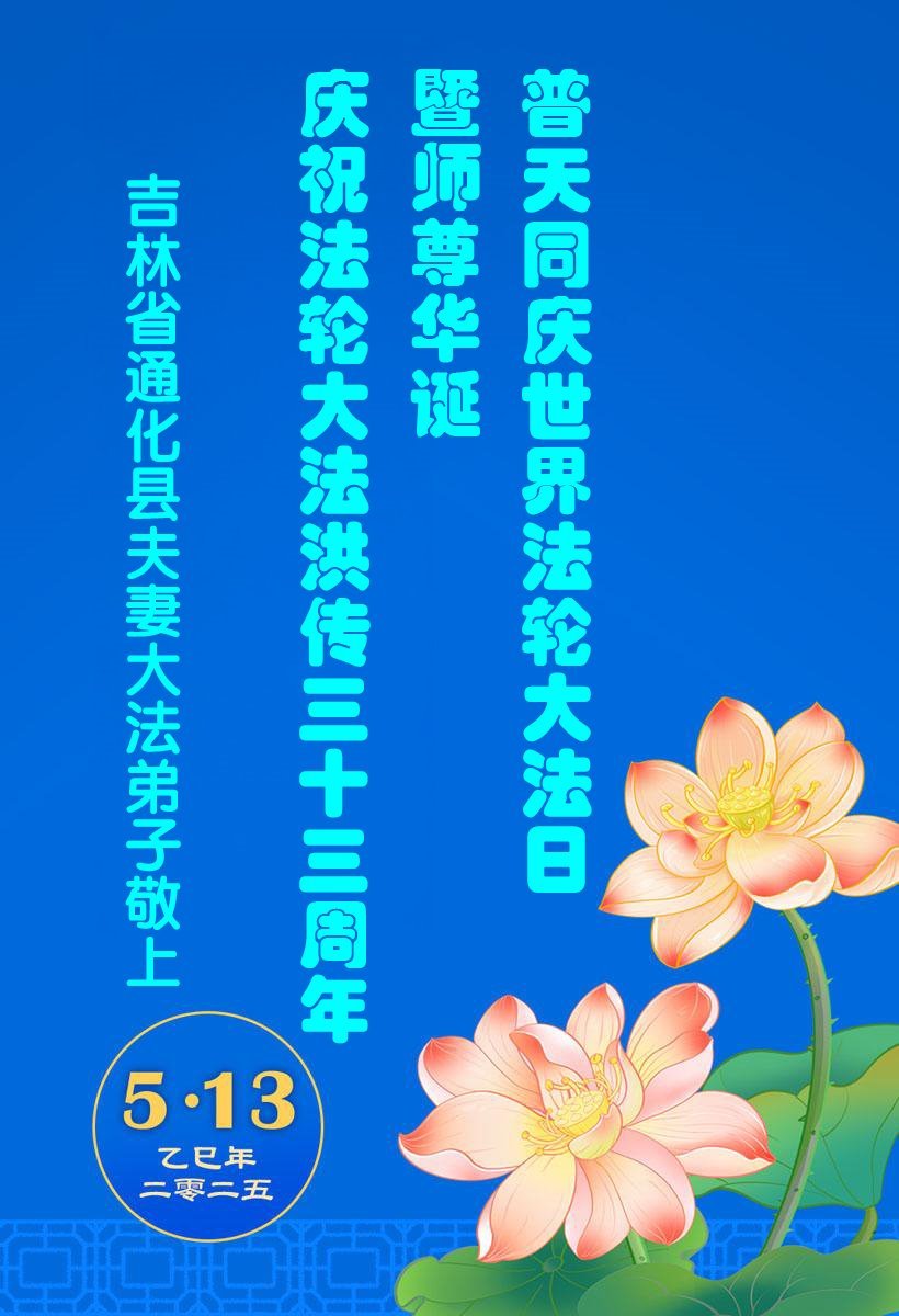 吉林省通化縣夫妻大法弟子普天同慶世界法輪大法日!恭賀法輪大法洪傳33週年!