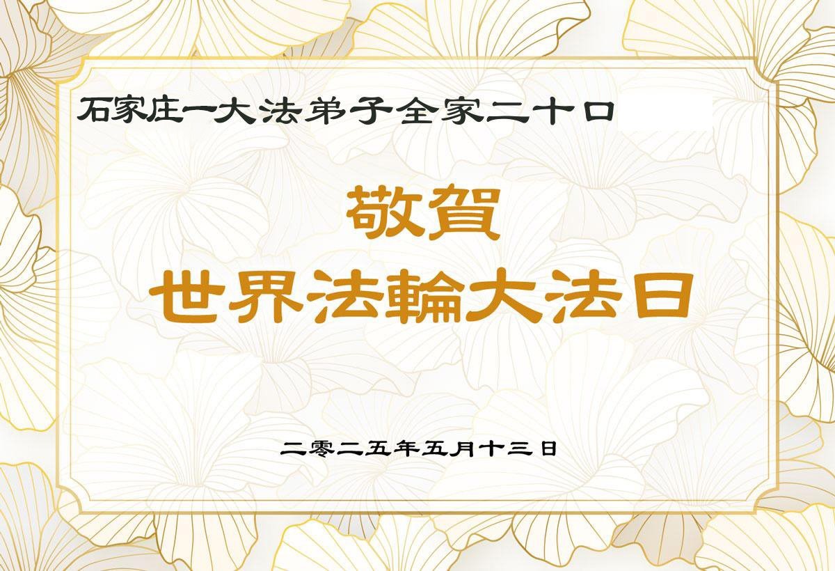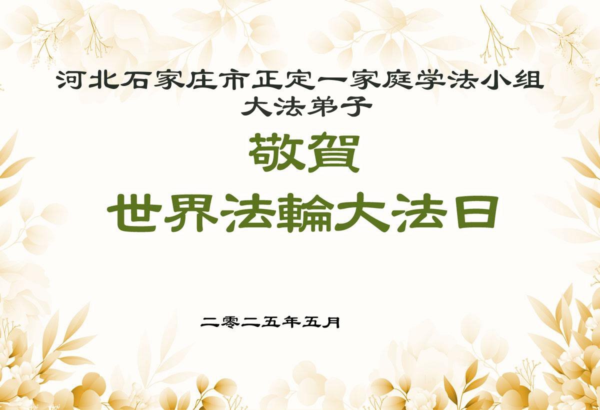 河北省石家莊市正定一家庭學法小組大法弟子恭賀世界法輪大法日!