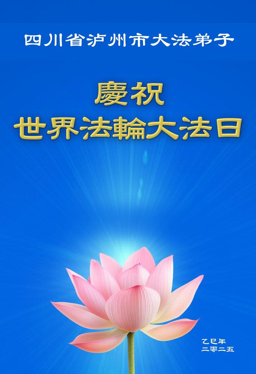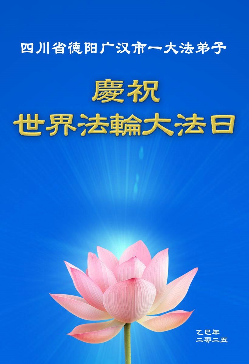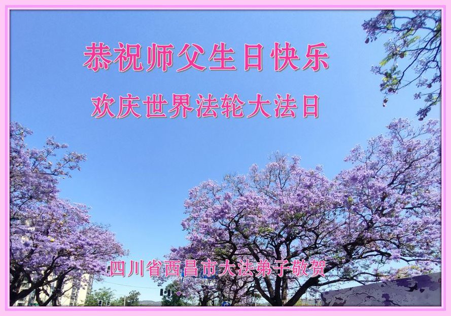 賀卡中的照片背景是西昌市的市(樹)花--藍花楹。每年陽曆五月之前,西昌市滿城的藍花楹就開放了,很壯觀。一樹的紫花十分靚麗醒目,同時散發淡淡的清香。今年西昌的藍花楹較往年推遲開放一個月左右,在5.13世界法輪大法日之時,正是藍花楹開得最繁盛的時候,彷彿今年藍花楹在和大法弟子一起來慶祝這個普天同慶的節日。西昌大法弟子盼望著慈悲偉大的師父回到大陸的那一天的到來。