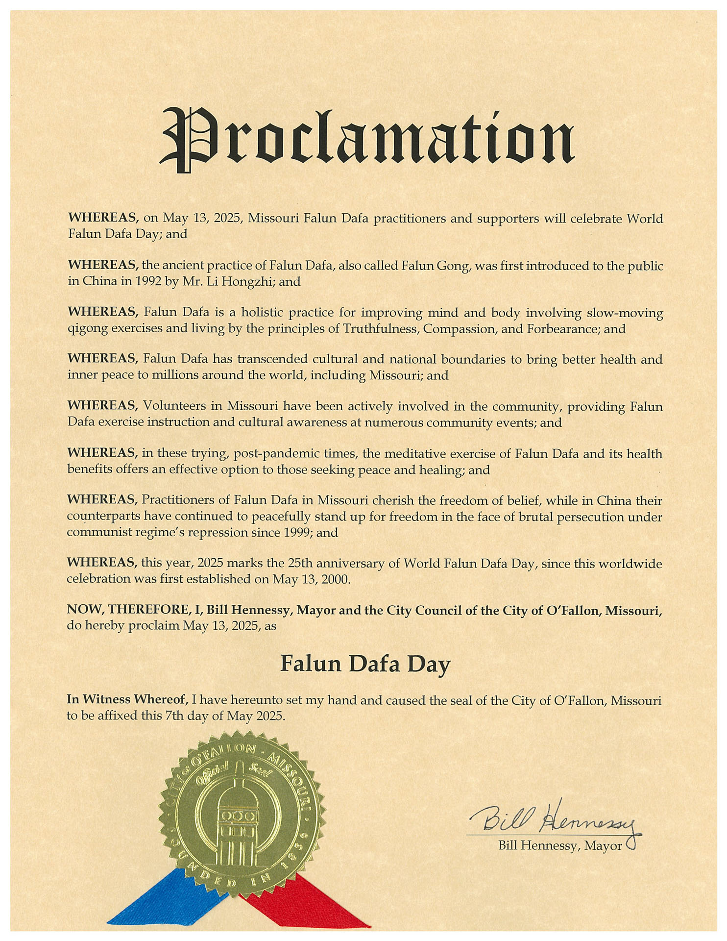 現在,鑑此,我,比爾﹒漢尼斯(Bill Hennessy),奧法隆市(City of O』Fallon)市長和市議會特此宣布,二零二五年五月十三日為法輪大法日。