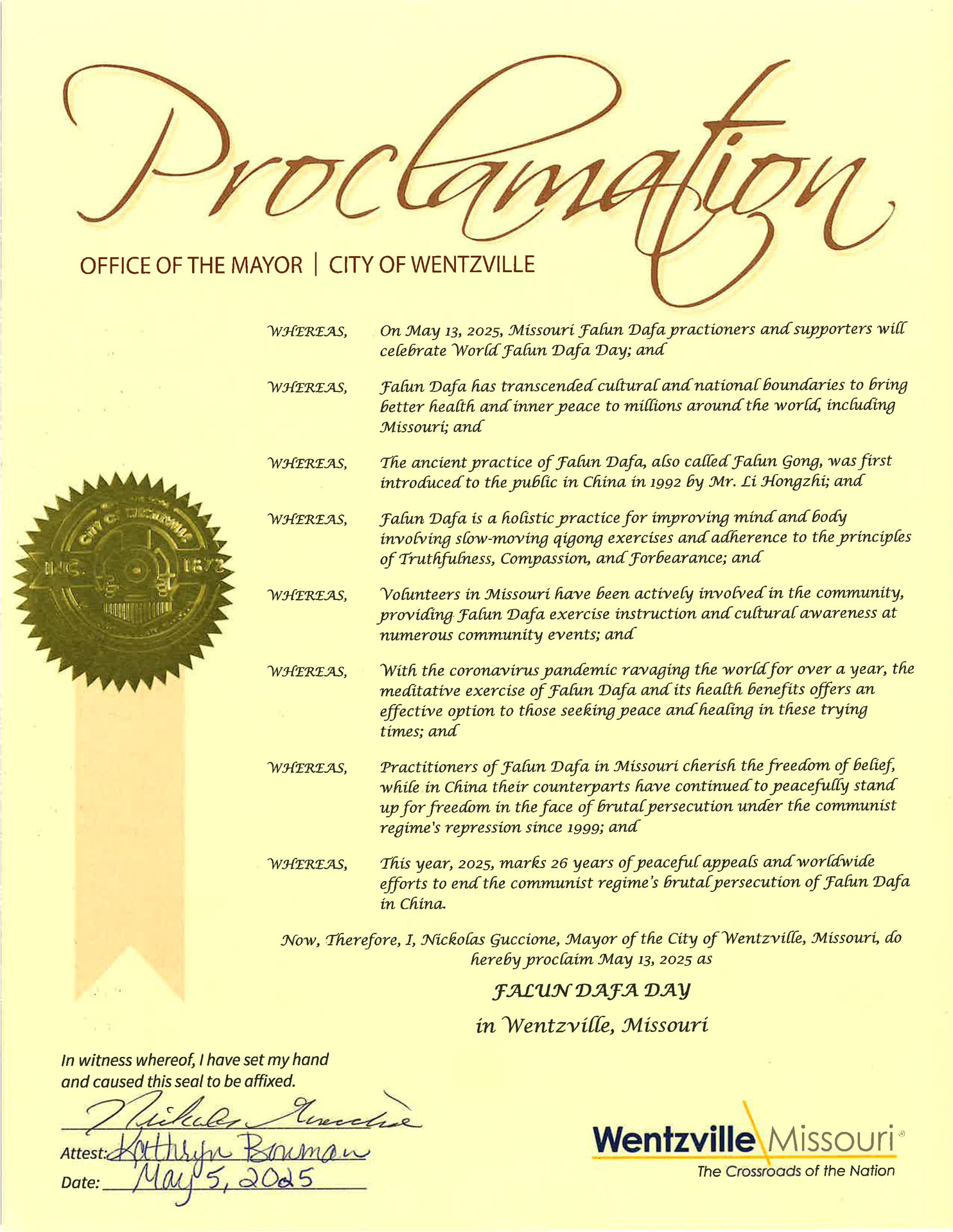 現在,鑑此,我,尼古拉斯﹒古奇昂(Nikolas Guccione),溫茨維爾市(City of Wentzville)市長,宣布二零二五年五月十三日為密蘇裏州溫茨維爾市的法輪大法日。