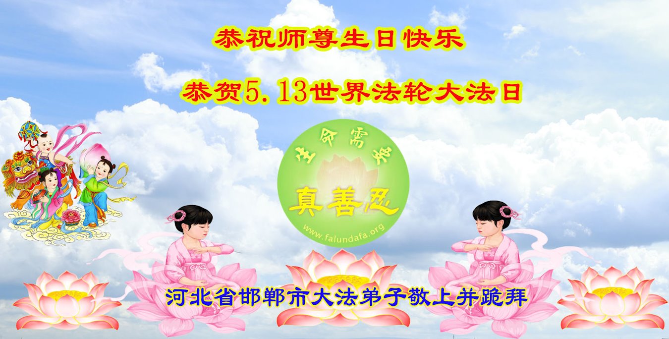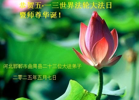 在這普天同慶的日子裏,我們夫妻倆恭賀世界法輪大法日暨恭祝師父生日快樂!弟子一定不辜負師父的慈悲苦度,一定修好自己,多救人,做好三件事,兌現誓約,圓滿隨師還。