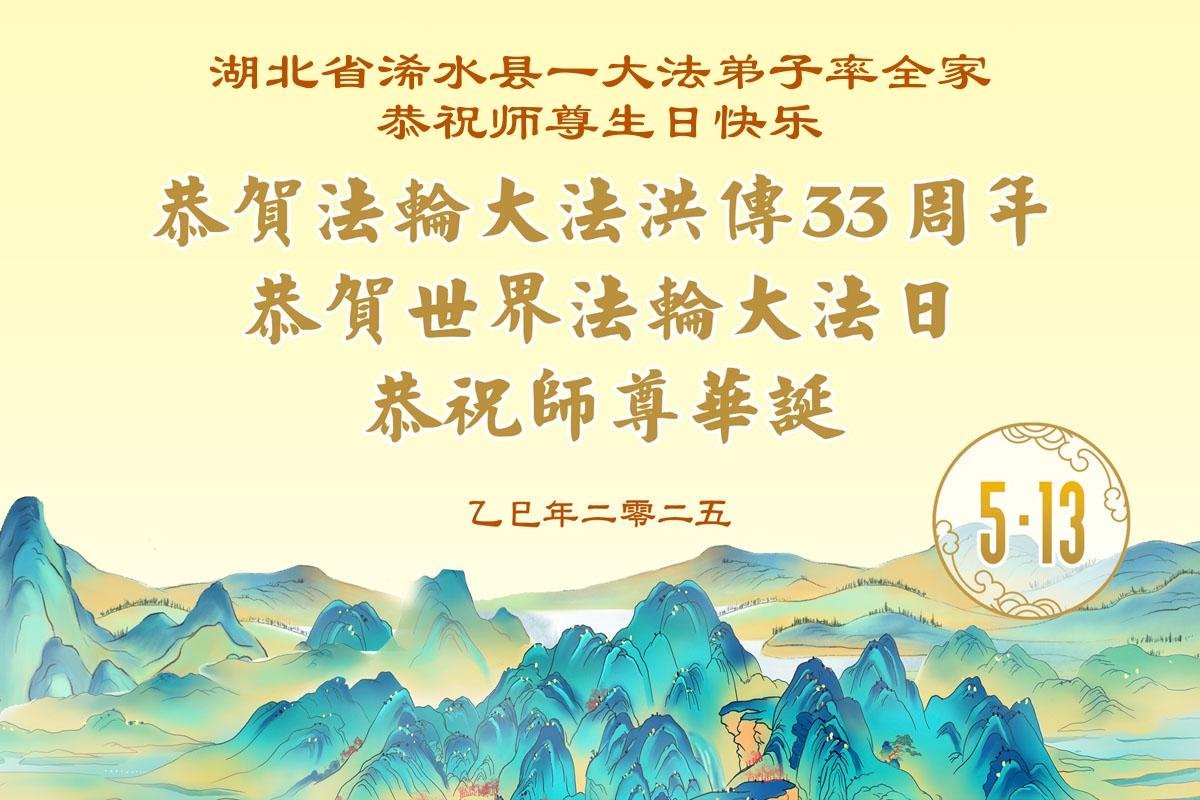 湖北省黃岡市浠水縣一弟子率全家恭祝世界法輪大法日暨師尊華誕!
