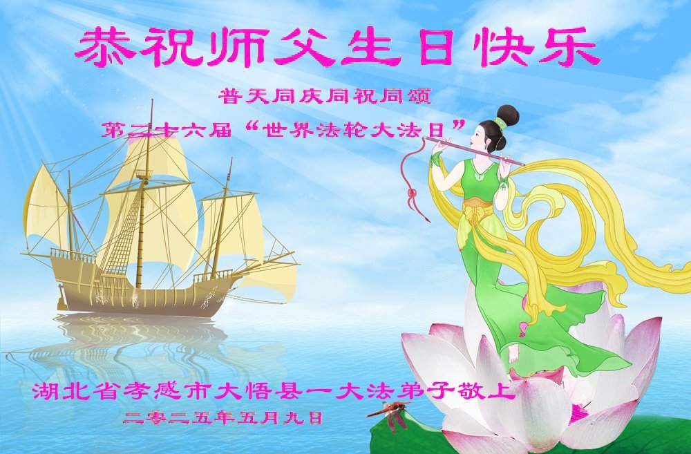 湖北省孝感市大悟縣一大法弟子慶賀世界法輪大法日!恭祝師父生日快樂!