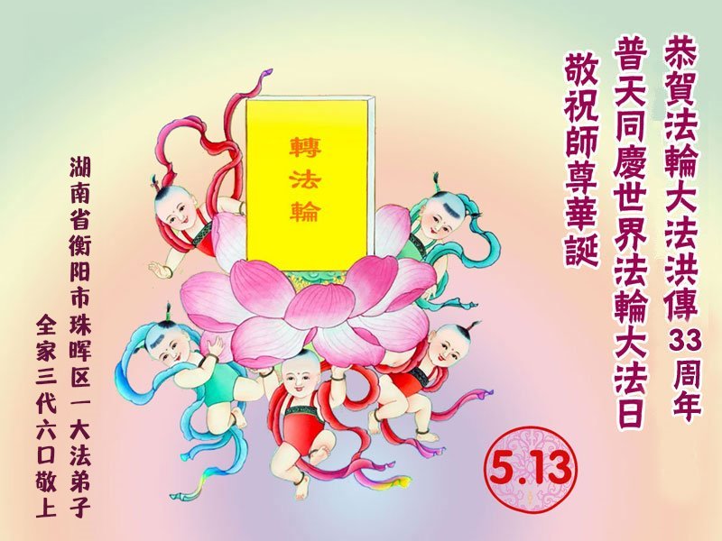 湖南省衡陽市珠暉區一大法弟子全家三代六口恭賀世界法輪大法日!