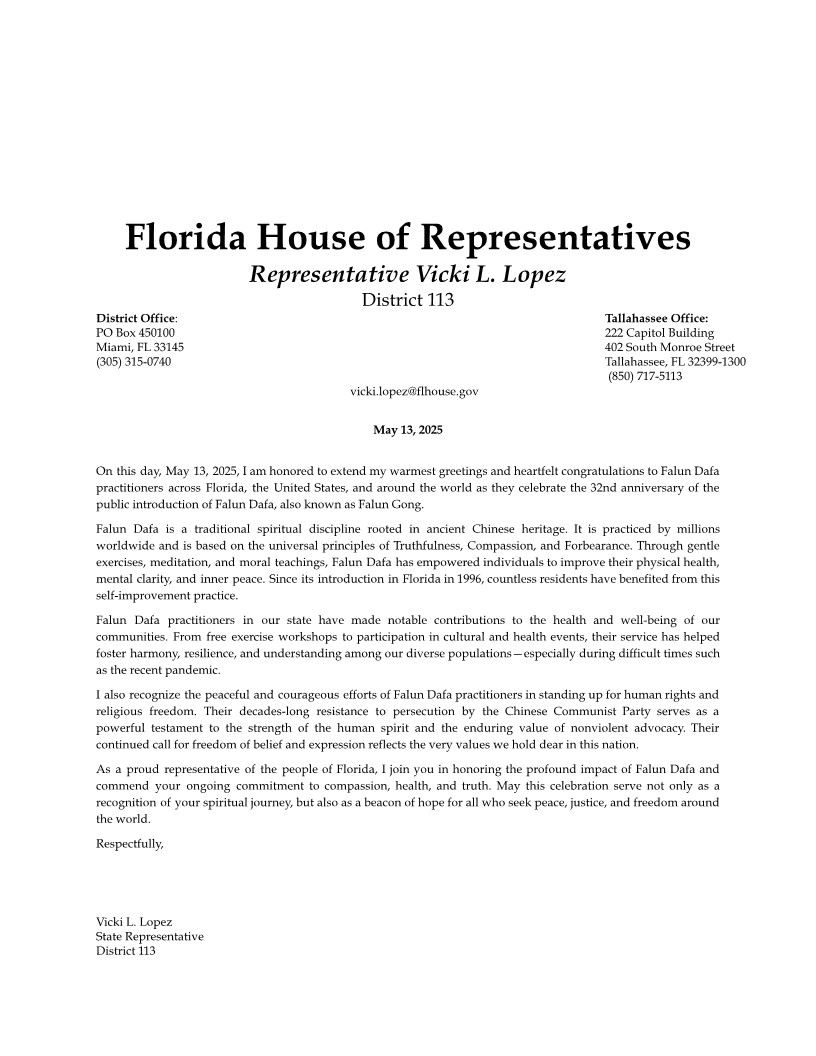作為佛羅里達州人民的驕傲代表,我誠摯敬佩法輪大法對社會所產生的深遠正面影響,並讚揚您們 對慈悲、健康與真理的堅持不懈。願此次慶典,不僅是對您們精神修煉之旅的肯定,也成為全球追 求和平、公義與自由之人士的一盞希望明燈。