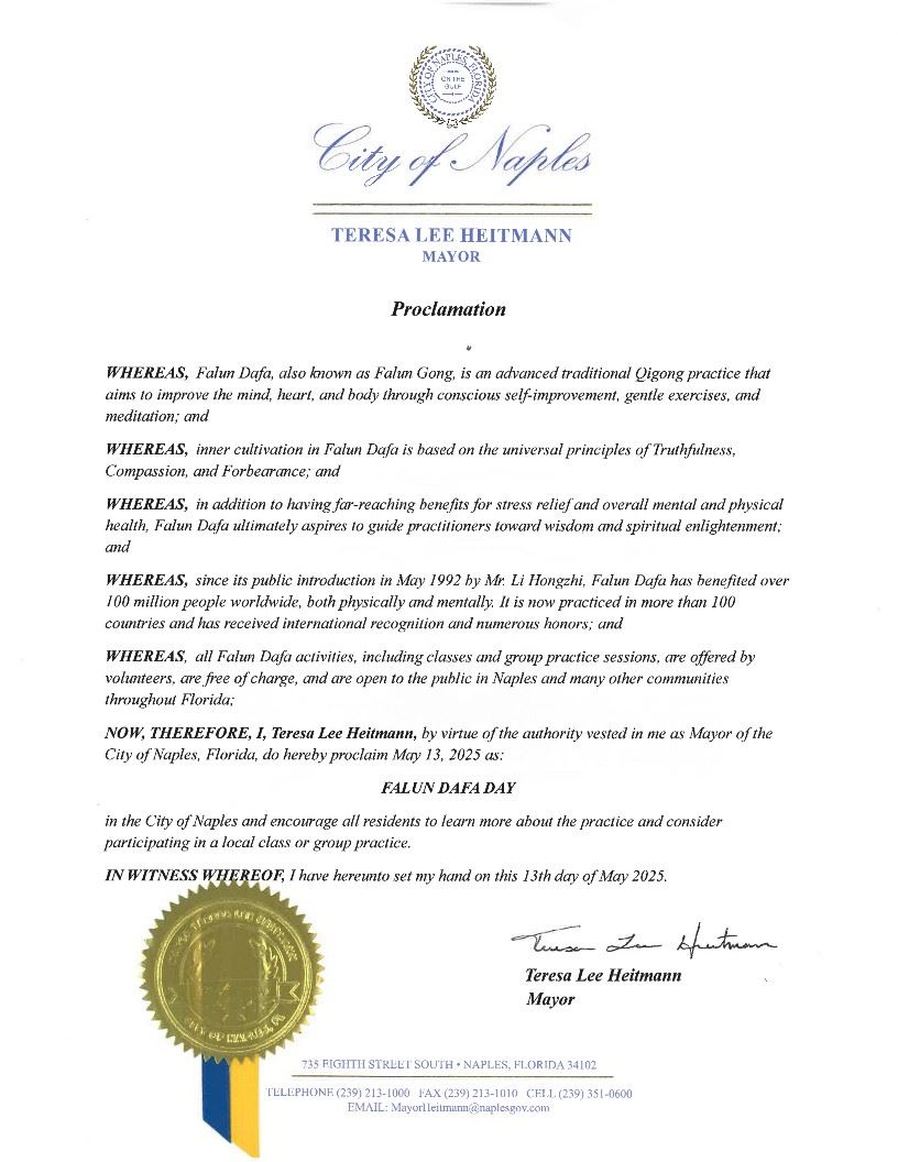 二零二五年第二十六屆「5‧13世界法輪大法日」前夕,美國佛羅里達州那不勒斯市(Naples)市長特蕾莎﹒海特曼(Teresa Heitmann)宣布二零二五年五月十三日為那不勒斯市法輪大法日,並鼓勵那不勒斯全體居民了解法輪功、上法輪功課。