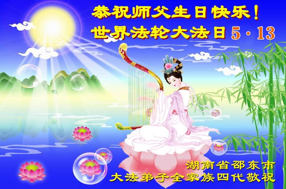 湖南省長沙市瀏陽市一大法弟子攜全家恭賀5.13世界法輪大法日暨敬祝師尊華誕!