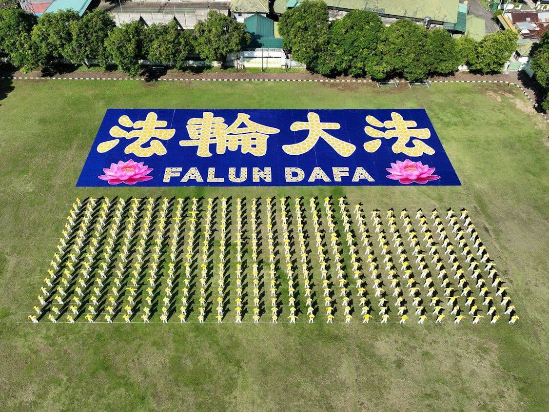 此次排字的圖案長58米、寬20.5米。由上百名學員們組成「法輪大法」四個漢字。學員們身穿黃色與白色服裝,按照順序進入場地,靜靜地站在指定位置,場面莊嚴祥和。