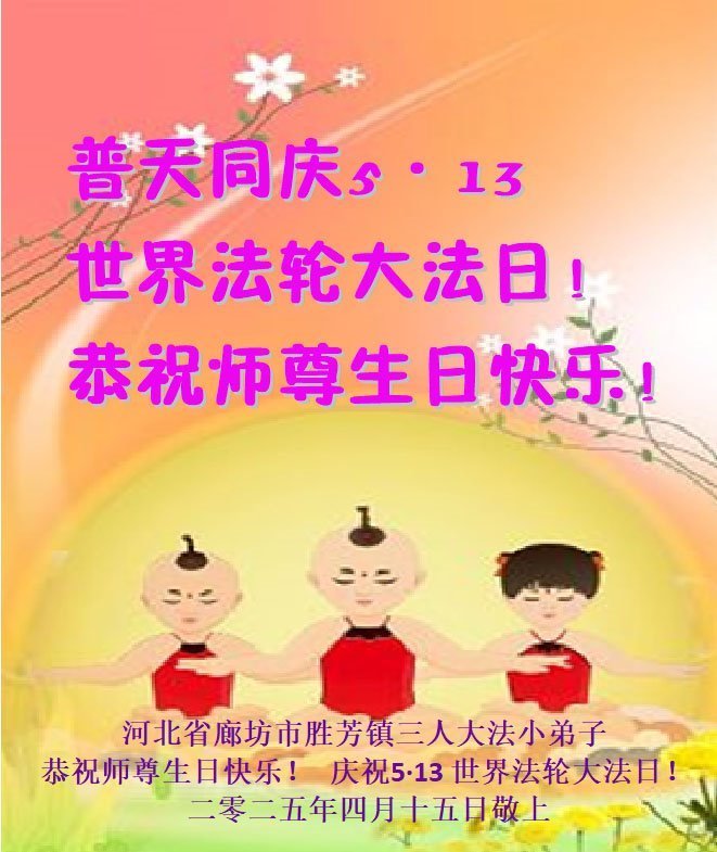 河北省廊坊市勝芳鎮三人大法小弟子恭祝師尊生日快樂!慶祝5﹒13世界法輪大法日!