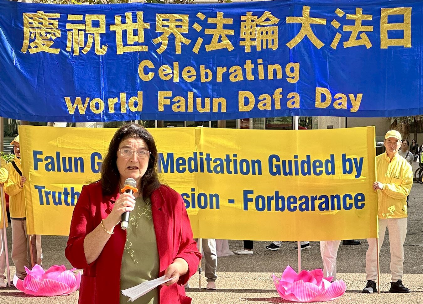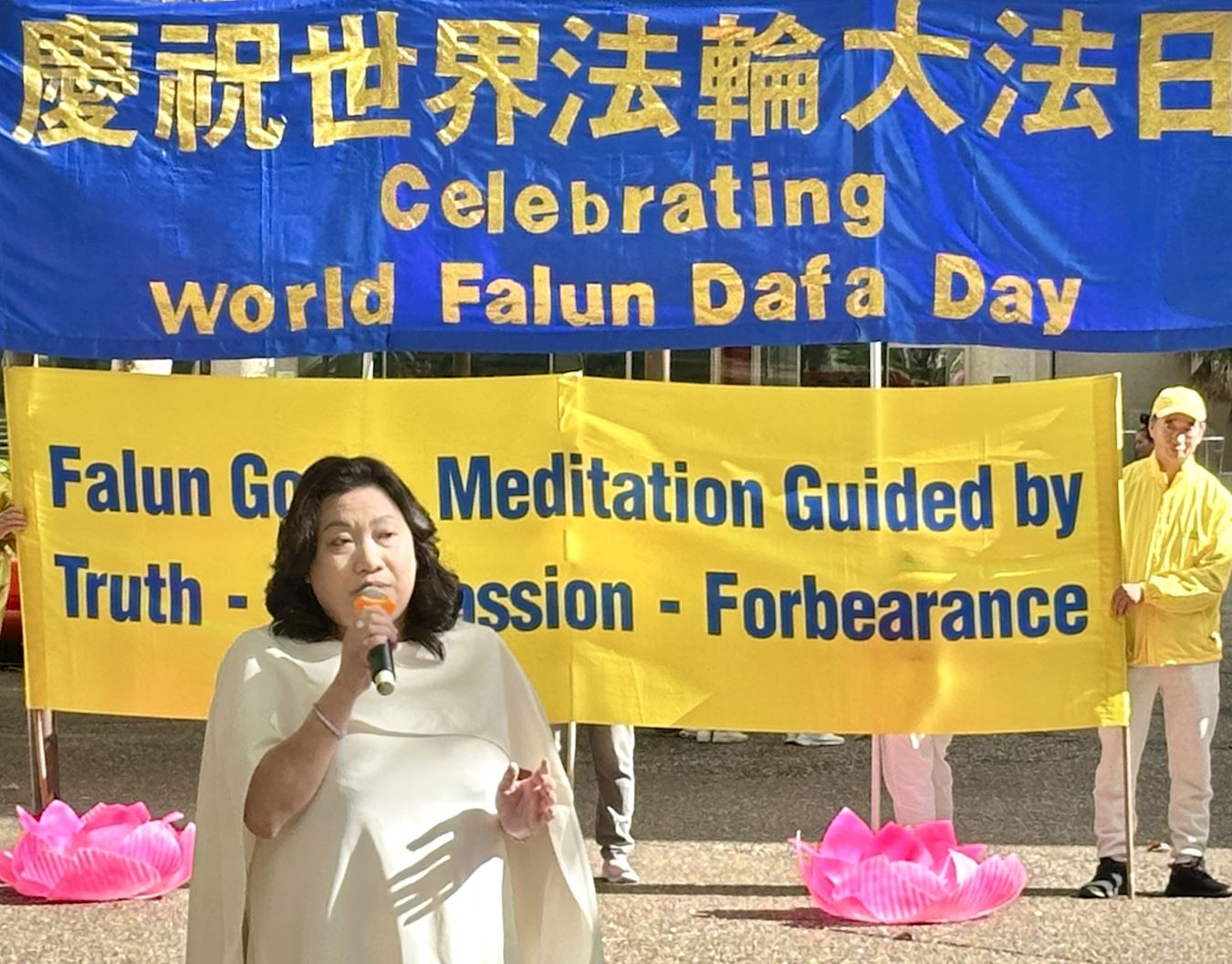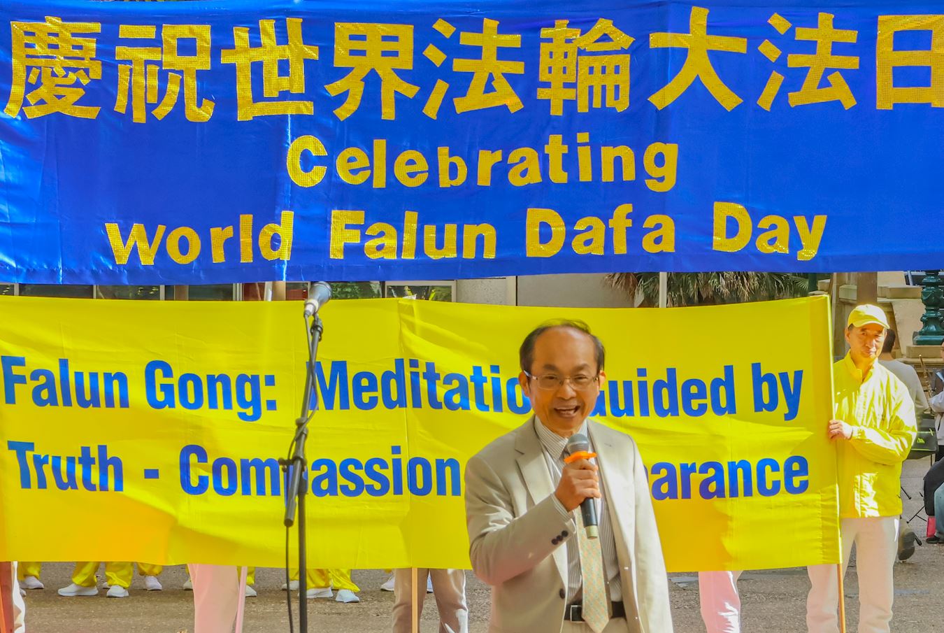 澳洲法輪大法學會發言人戴勒(John Deller)表示:「今天,我們慶祝一個特殊的日子──一九九二年五月十三日,李洪志大師首次將法輪大法的偉大法理和真、善、忍原理傳授公眾。截至一九九九年,在中國,已有7000多萬人修煉。如今,法輪大法已弘傳全球100多個國家,法輪大法書籍已被翻譯成50種文字。