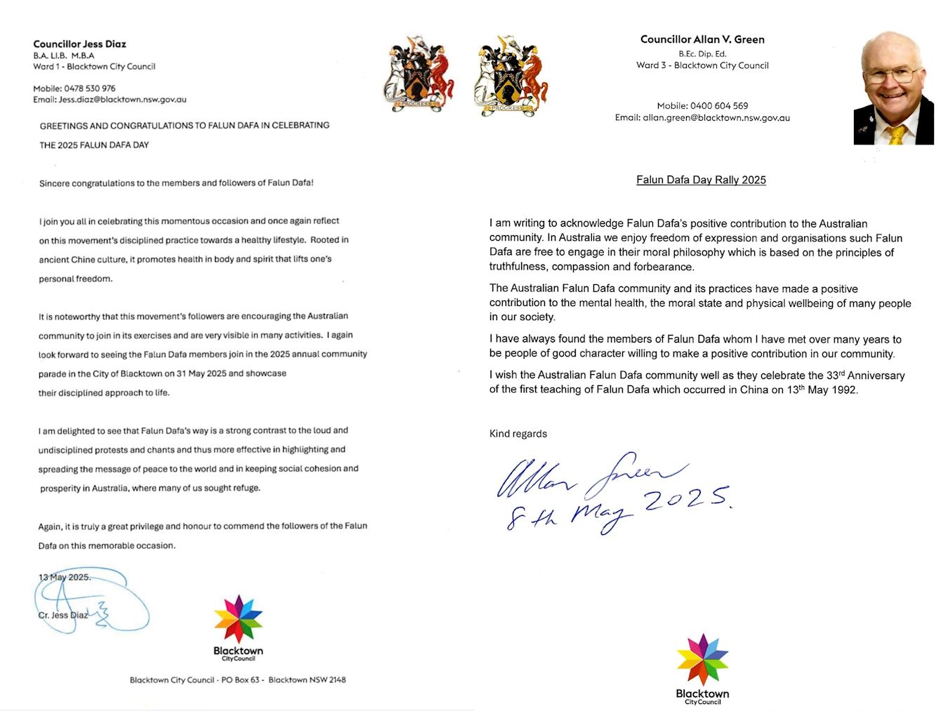 悉尼黑鎮(Blacktown)市議員艾倫﹒格林(Allan Green)在賀信中讚揚法輪大法對澳洲社區所作做出的積極貢獻。