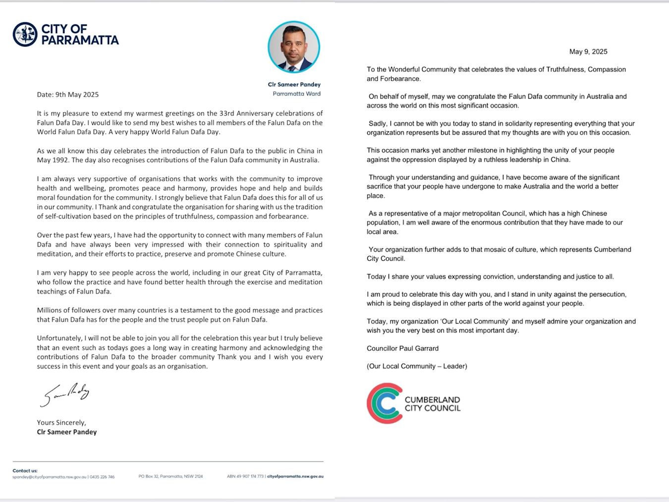 ![]() 圖9:帕拉馬塔(Parramatta)市議員薩米爾﹒潘迪(Sameer Pandey)和坎伯蘭(Cumberland)市議員保羅﹒加勒德(Paul Garrard)的賀信 |
