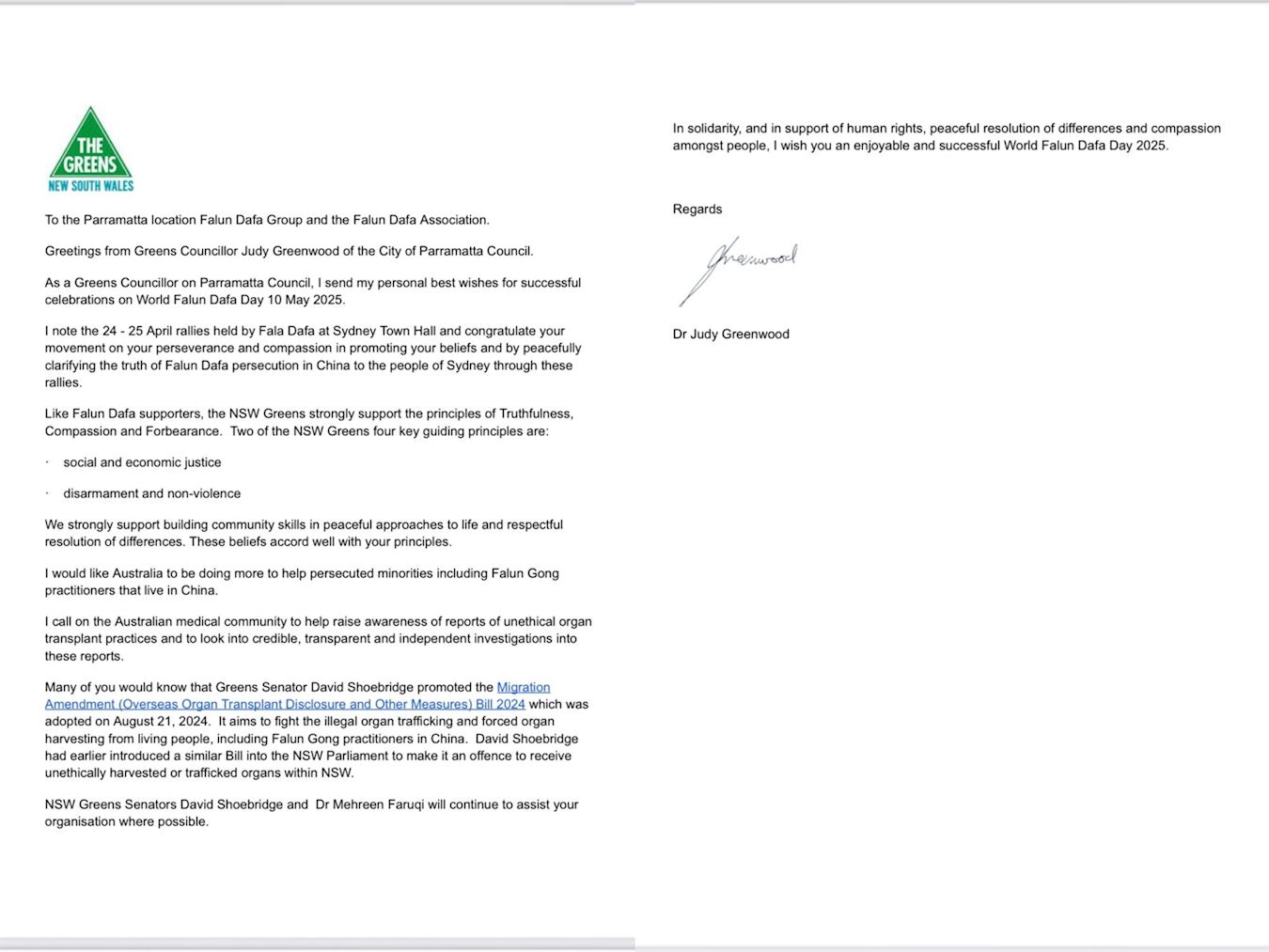 悉尼帕拉馬塔(Parramatta)市議員朱迪﹒格林伍德(Judy Greenwood)在賀信中表示:「向法輪大法社團致以誠摯的祝福,並祝願世界法輪大法日的慶祝活動圓滿成功。」