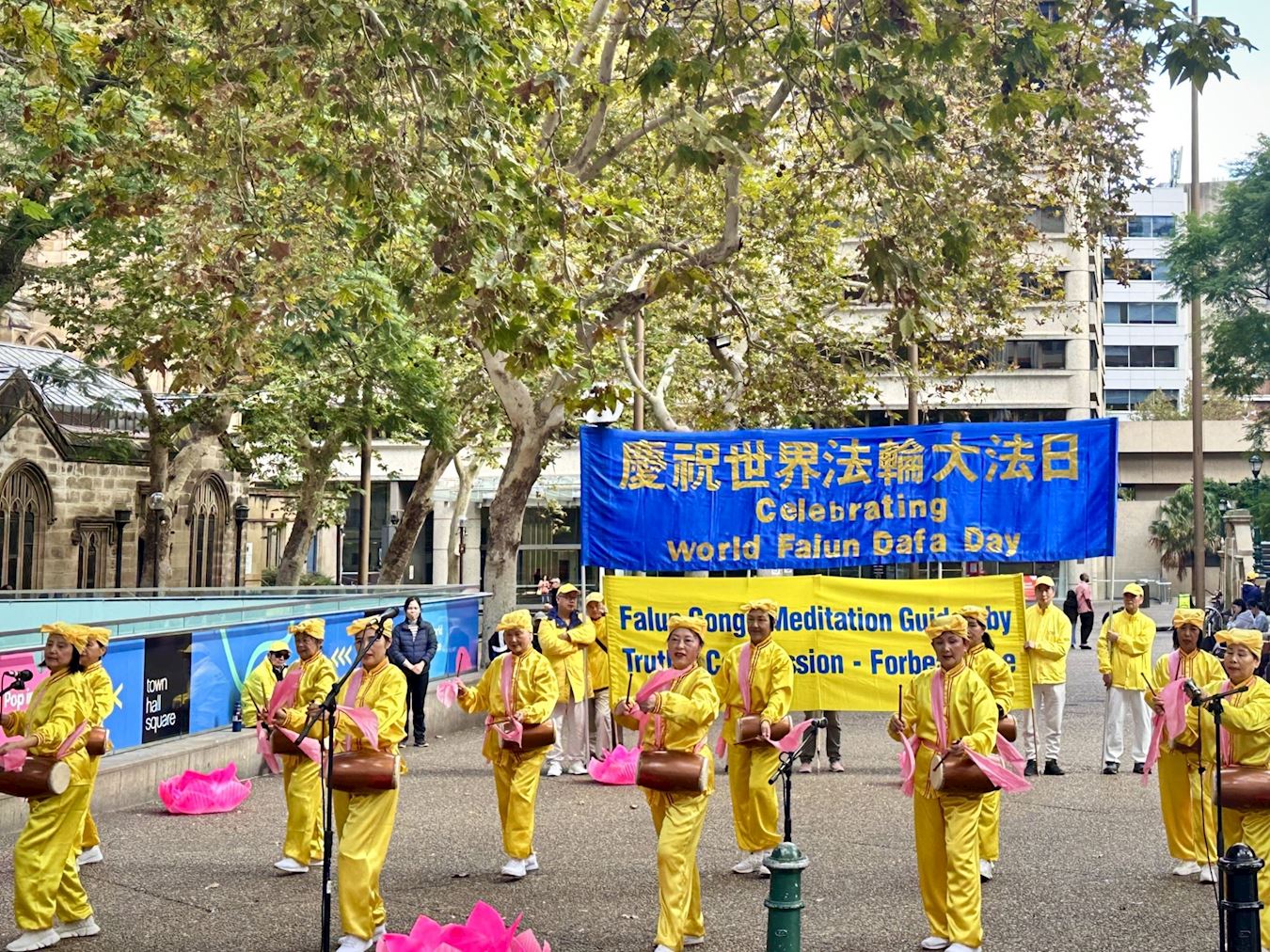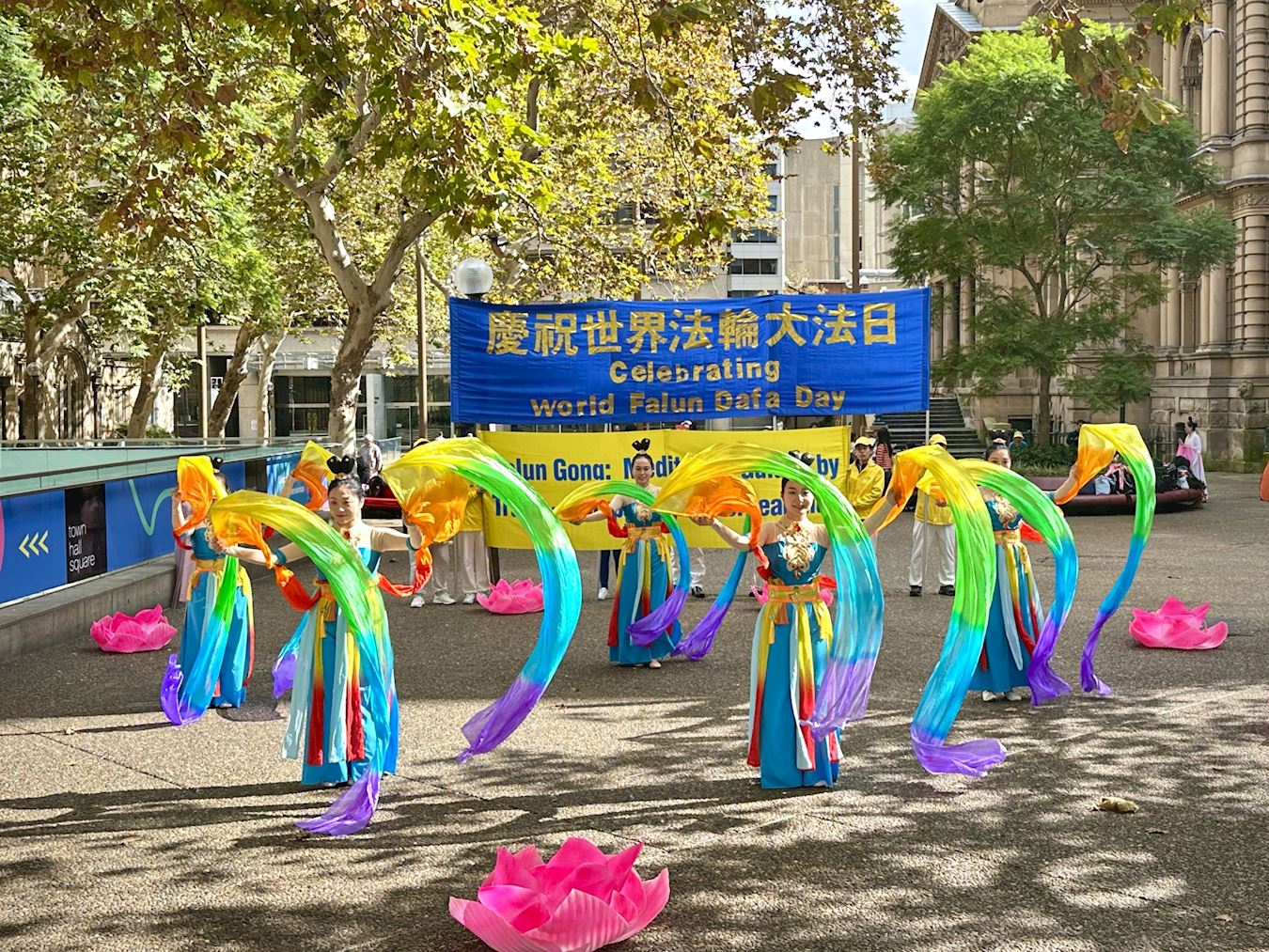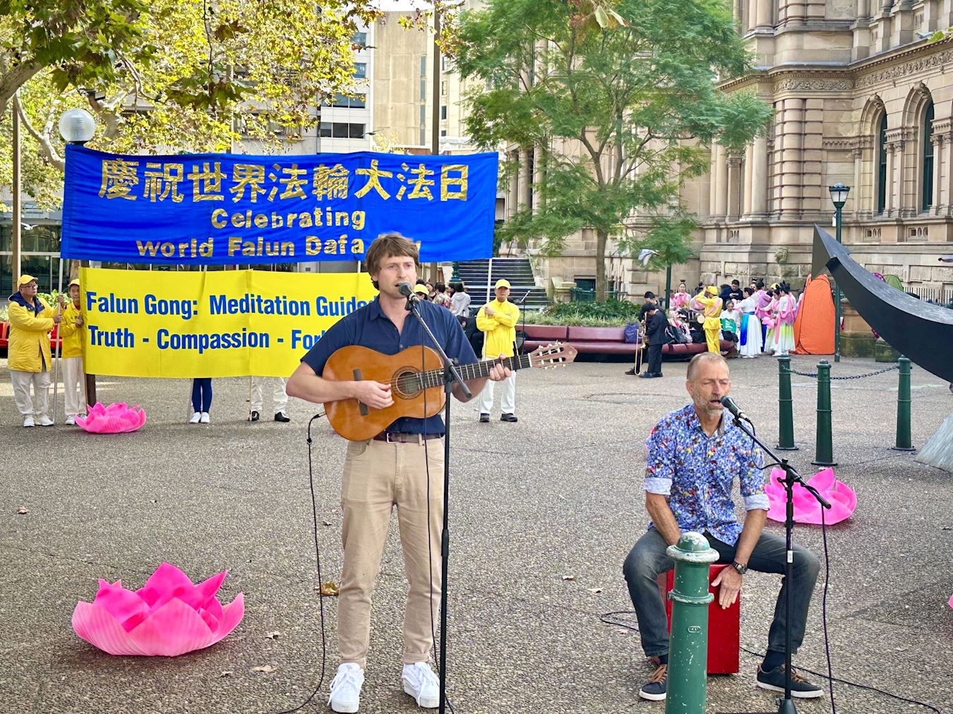 ![]() 圖1:法輪功學員與悉尼各界人士在悉尼市政廳前舉行集會和文藝表演,歡慶法輪大法日。 |