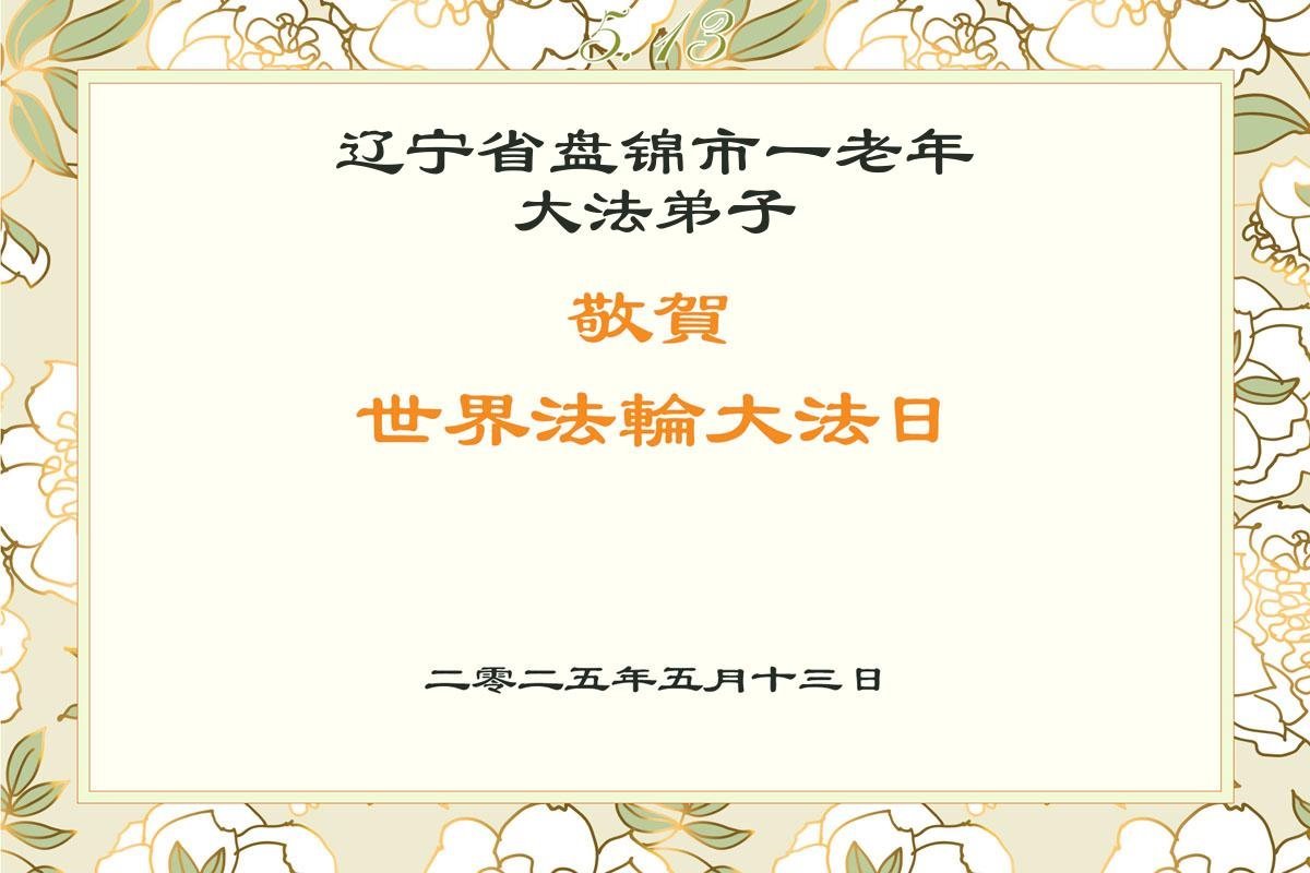 遼寧省盤錦市一老年大法弟子恭賀世界法輪大法日!