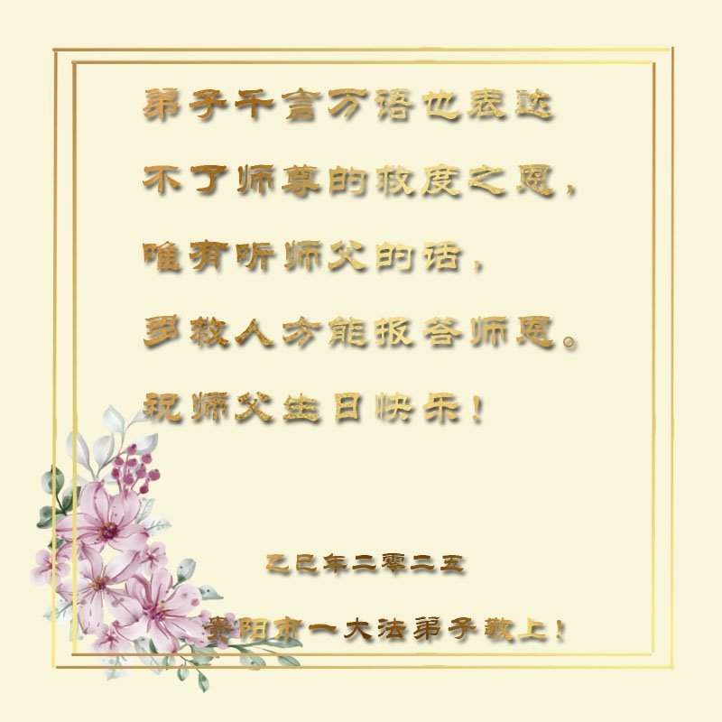 師父您好!貴州六盤水市全體大法弟子恭祝師父生日快樂!不管邪惡耍甚麼花招,也不管邪惡利用世人做甚麼手腳,弟子們就相信師父!相信大法!誰也撼動不了大法弟子這顆堅如磐石的修煉之心。謝謝師父的慈悲救度!再次祝師父生日快樂!合十