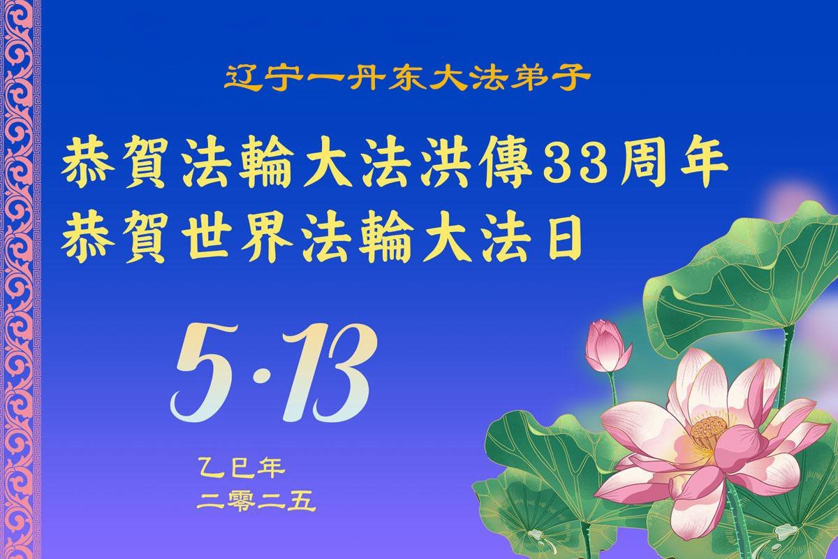 遼寧省丹東市東港市大法弟子慶祝法輪大法洪傳世界三十三週年!