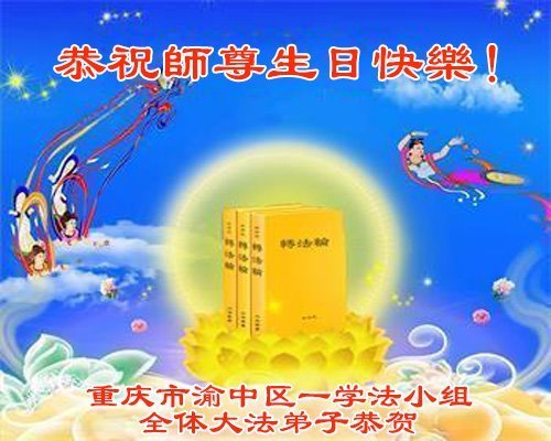 慈悲偉大的師父好!我們是重慶市南岸區一學法小組,在這普天同慶的喜慶節日裏,我們學法小組全體大法弟子恭祝師父生日快樂!感恩師父慈悲苦度!感恩師父對蒼宇眾生的無量恩澤!師父的付出、師父的承受我們永遠銘刻在心。我們唯有努力精進來感恩師父。