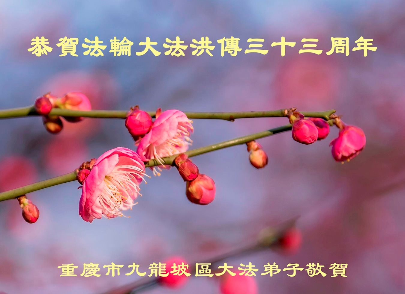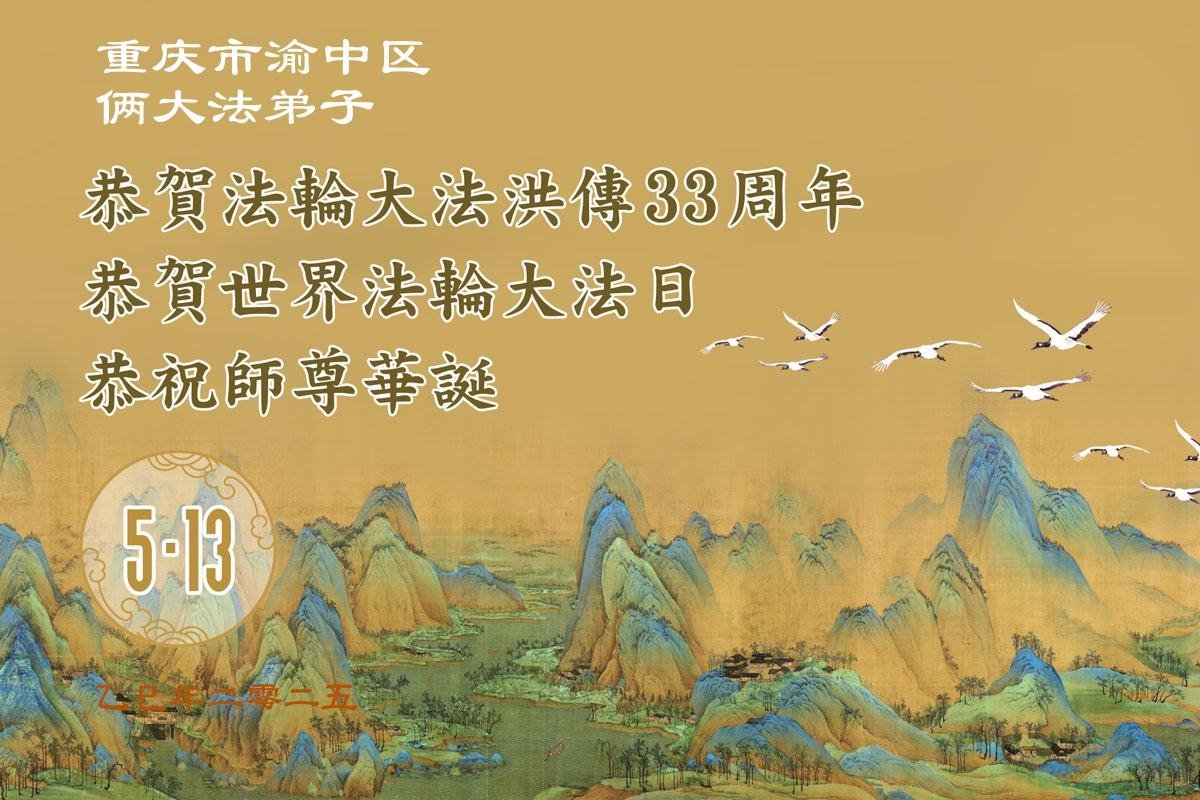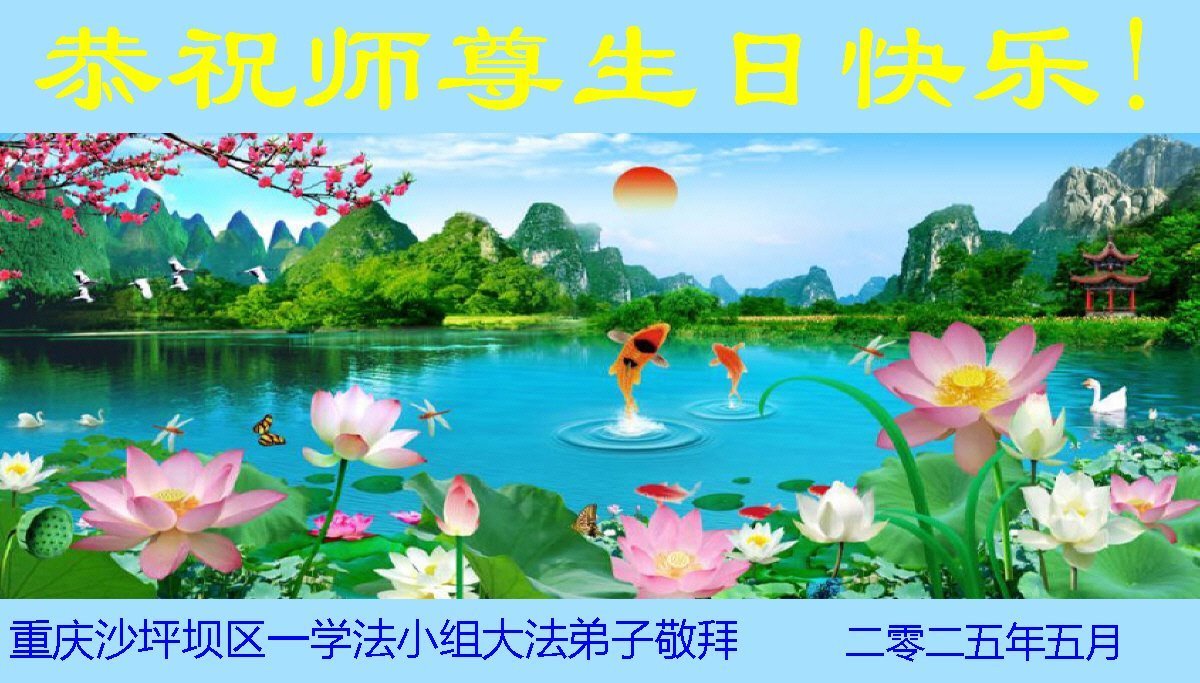 慈悲偉大的師父好!我們是重慶市南岸區一學法小組大法弟子,恭祝師尊生日快樂!恭賀法輪大法洪傳33週年!