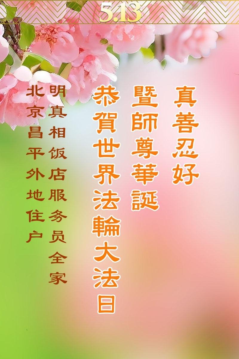 北京昌平外地住戶明真相飯店服務員全家4口,恭祝李洪志大師,生日快樂!開心快樂!