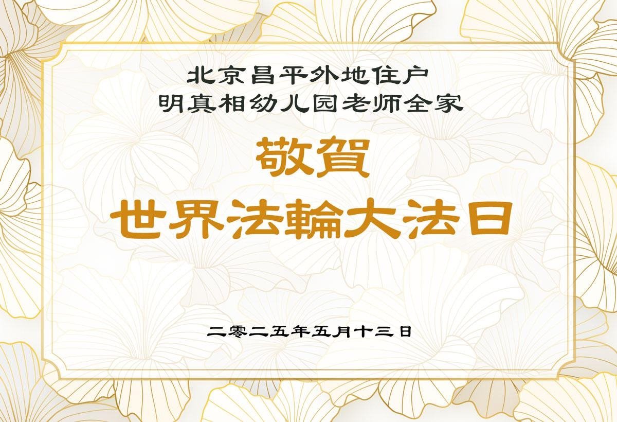 北京昌平外地住戶明真相幼兒園王老師全家4口恭祝李洪志大師生日快樂!