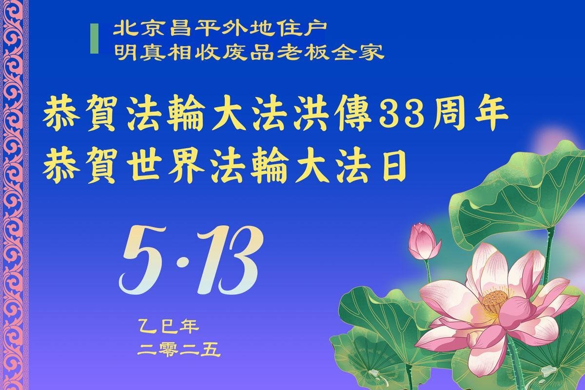 北京昌平外地住戶明真相收廢品老闆全家5口,祝李洪志師父,生日快樂!早日回國!