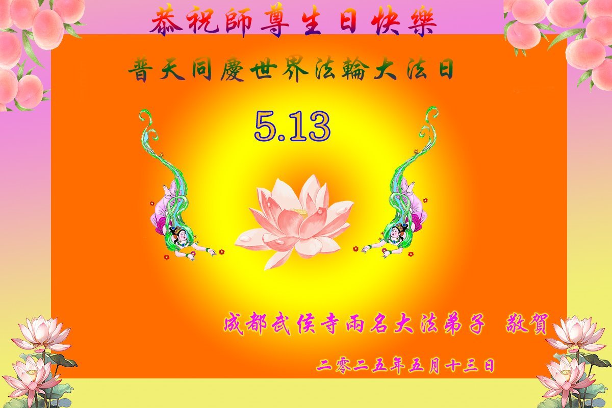 四川省成都武侯寺兩名大法弟子恭祝師尊生日快樂!