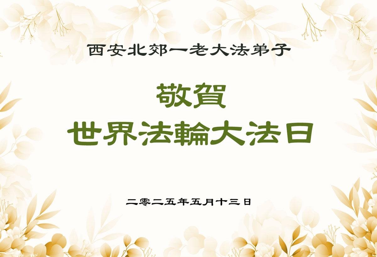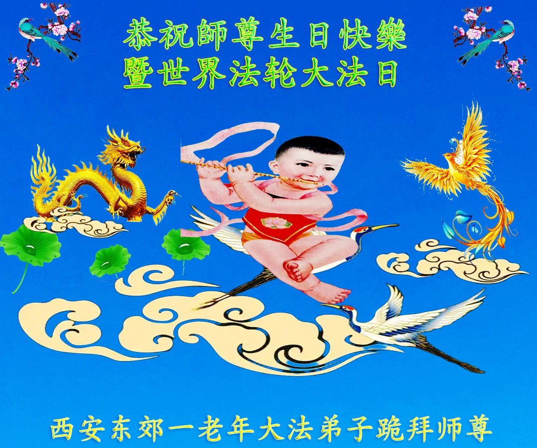 陝西省西安東郊一老年大法弟子恭祝師尊生日快樂暨法輪大法日!