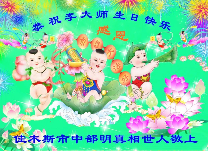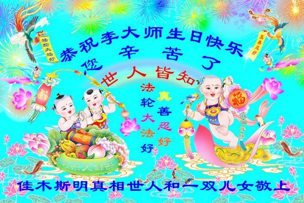 我和母親同修懷著無比激動喜悅的心情衷心祝願師父生日快樂!我也代表明真相的丈夫和兒女們向慈悲偉大的師父問好!弟子無法表達對師父的無限感恩,只有堅定的信師信法,精進實修,做好三件事,努力完成史前誓約,多救人,圓滿隨師父回家。