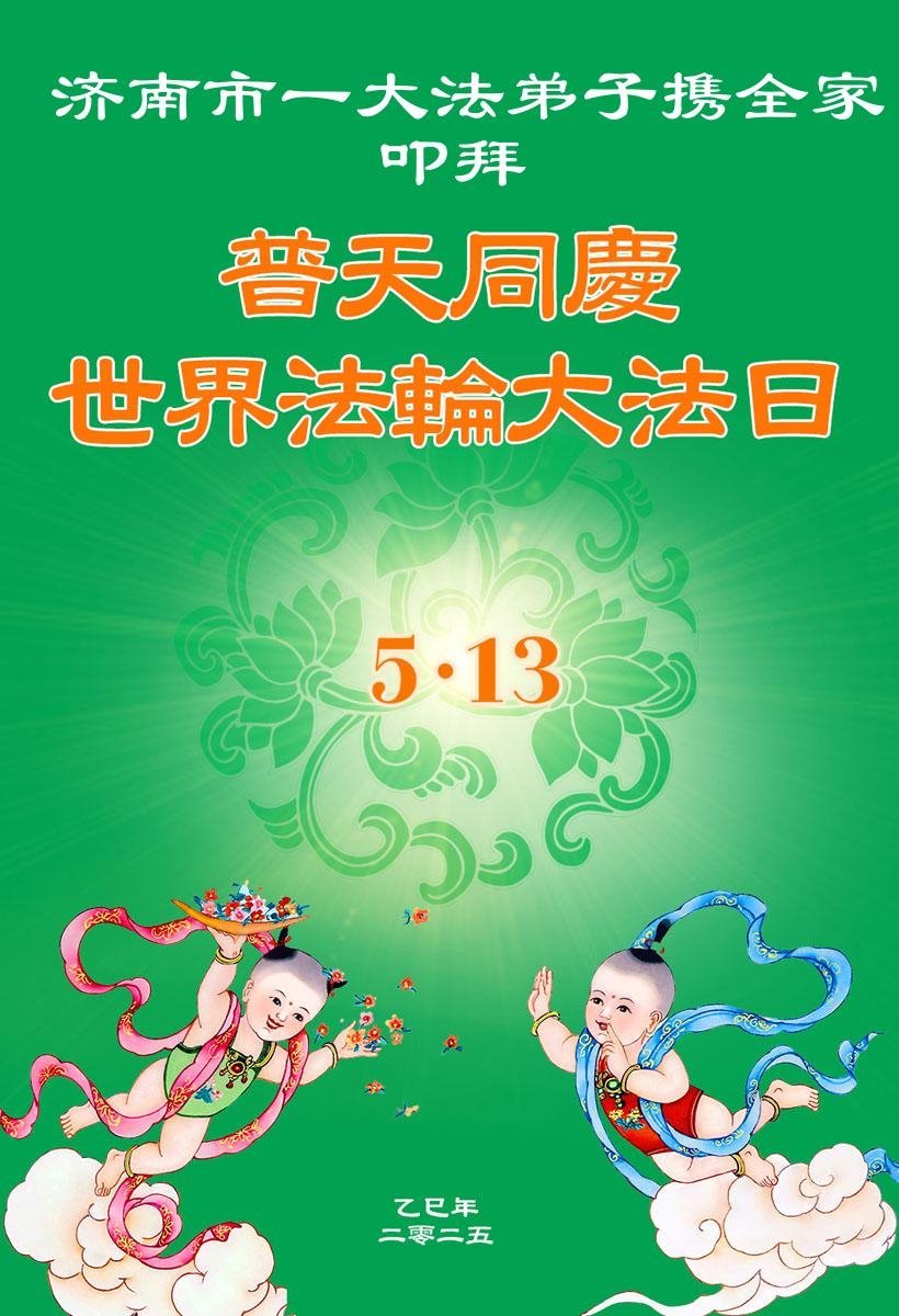 山東省濟南一大法弟子攜全家敬賀世界法輪大法日暨師尊華誕!感恩師尊慈悲救度!