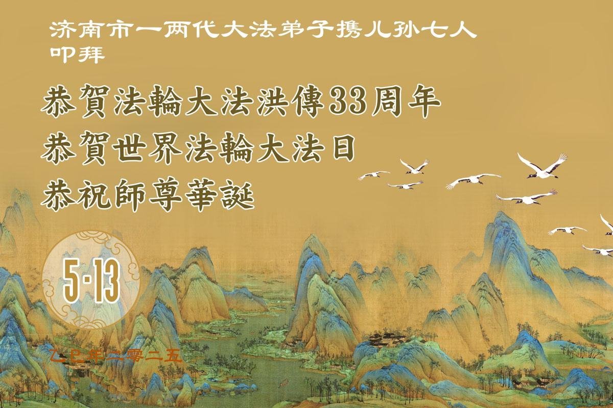 山東省濟南一家三位大法弟子恭祝師尊生日快樂!恭賀世界法輪大法日!