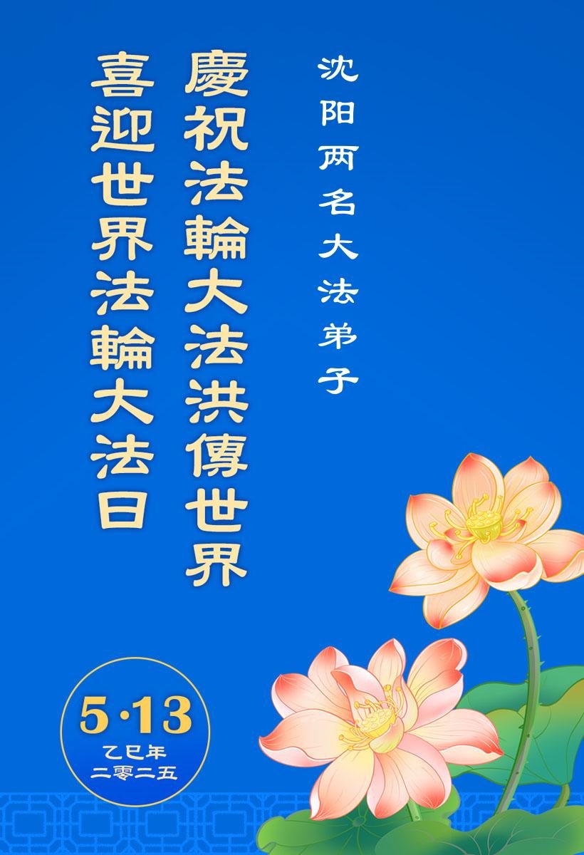 遼寧省瀋陽市兩名大法弟子恭祝師尊生日快樂!同祝世界法輪大法日!