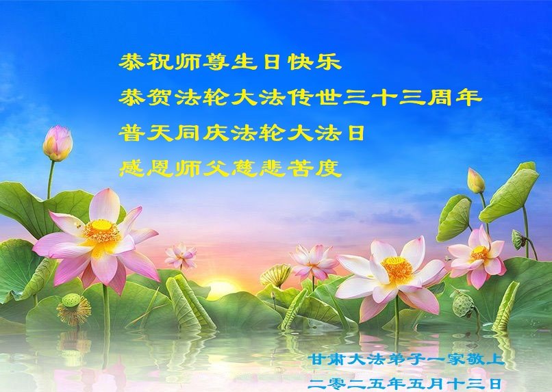甘肅省大法弟子一家恭祝師尊生日快樂!恭賀法輪大法傳世三十三週年!同慶法輪大法日!感恩師父慈悲苦度!
