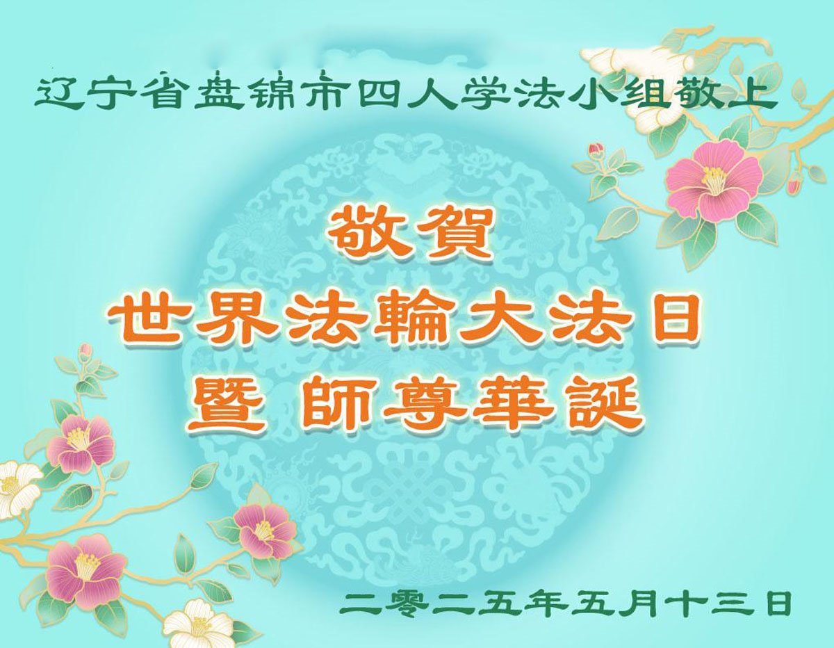 遼寧省盤錦市四人學法小組大法弟子恭祝慈悲偉大的師尊生日快樂!同祝世界法輪大法日!