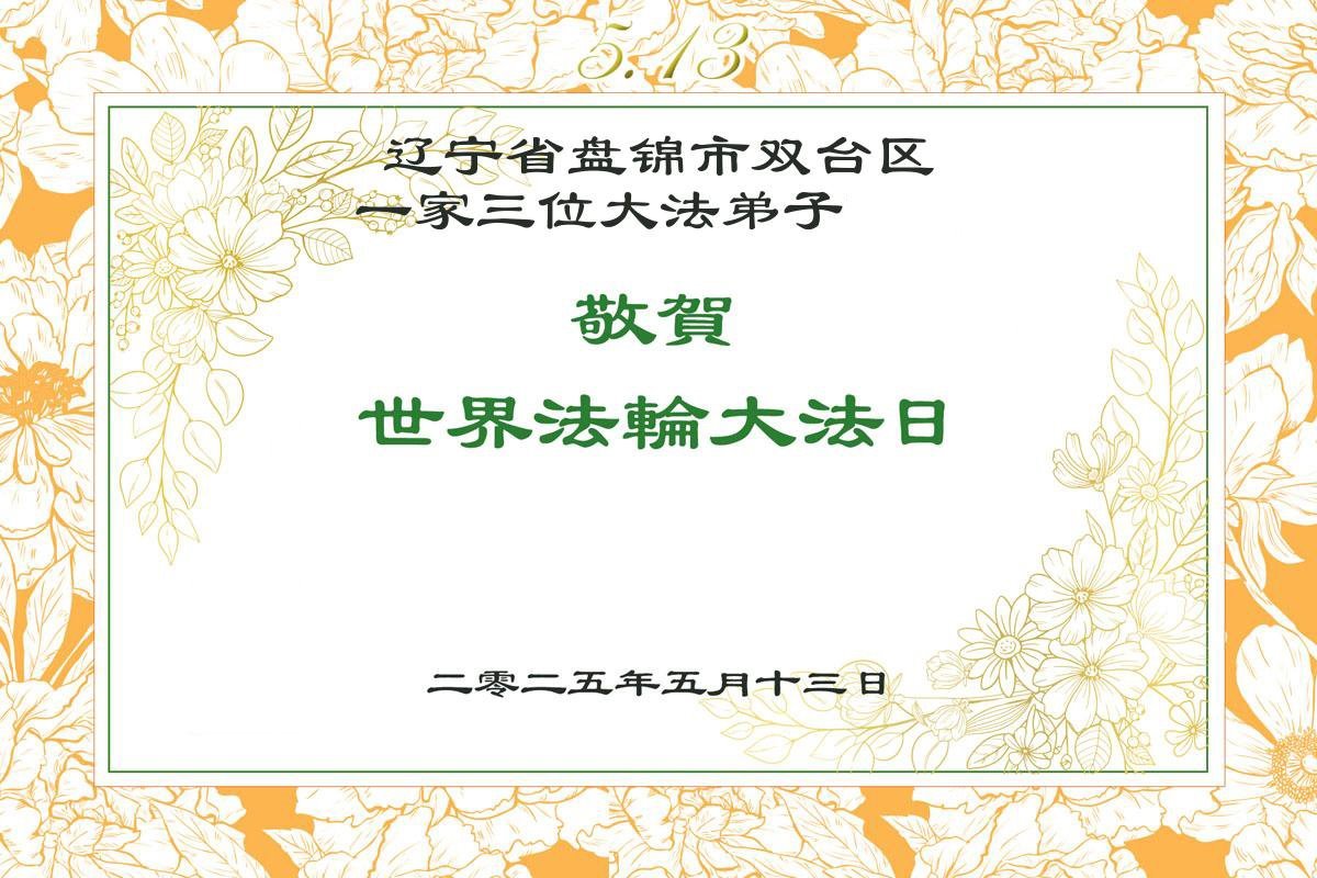 遼寧省盤錦市雙台區一家三位大法弟子慶賀世界法輪大法日!恭祝師尊生日快樂!