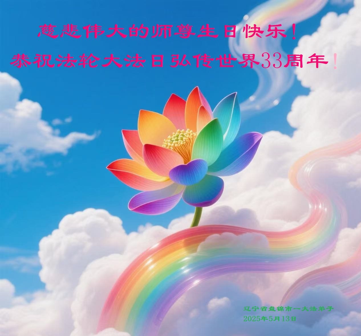 遼寧省盤錦一大法弟子恭祝慈悲偉大的師尊生日快樂!同祝世界法輪大法日!叩謝師尊救度洪恩!
