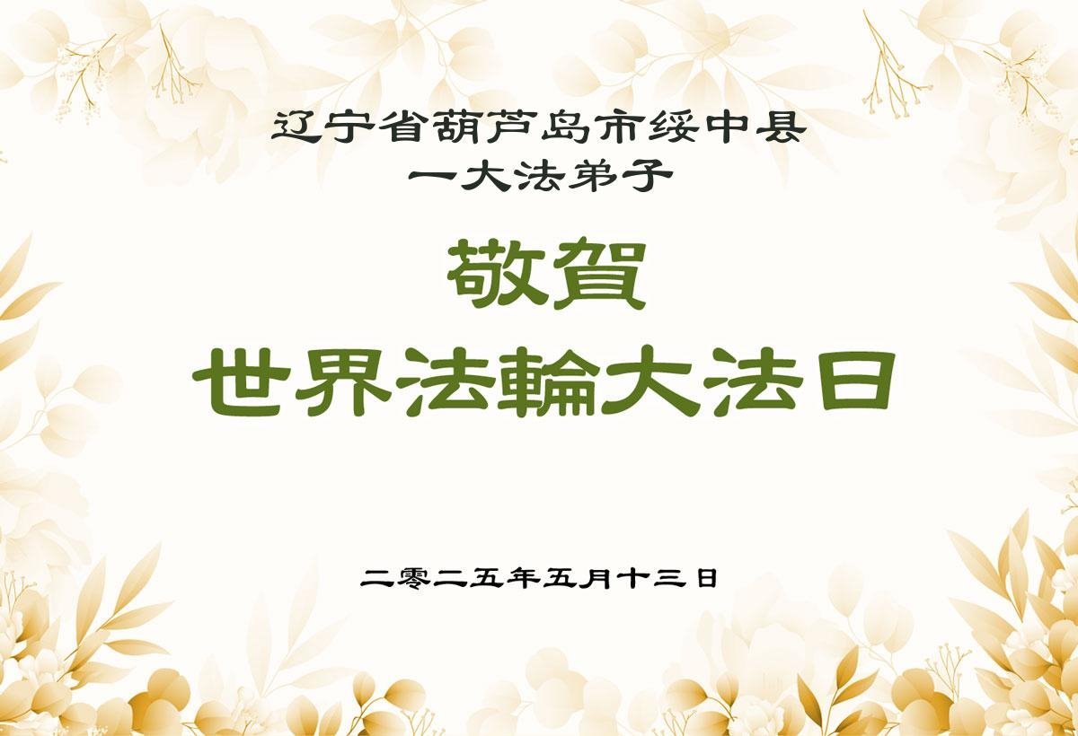 遼寧省葫蘆島市綏中縣一大法弟子慶祝世界法輪大法日暨師父華誕!