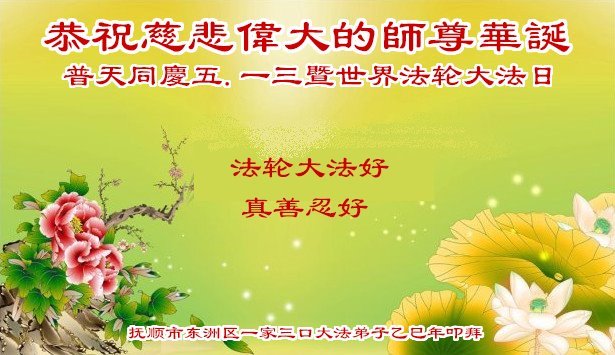 遼寧省撫順市東洲區一家三口大法弟子恭祝慈悲偉大的師尊生日快樂!普天同慶世界法輪大法日!