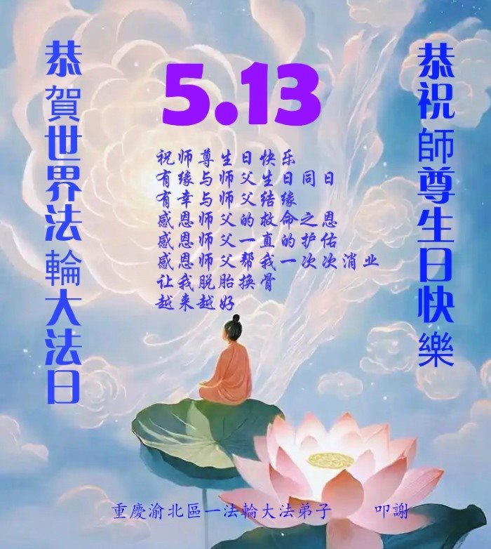 重慶江北一大法弟子恭祝慈悲的師尊生日快樂!祝賀世界法輪大法日!