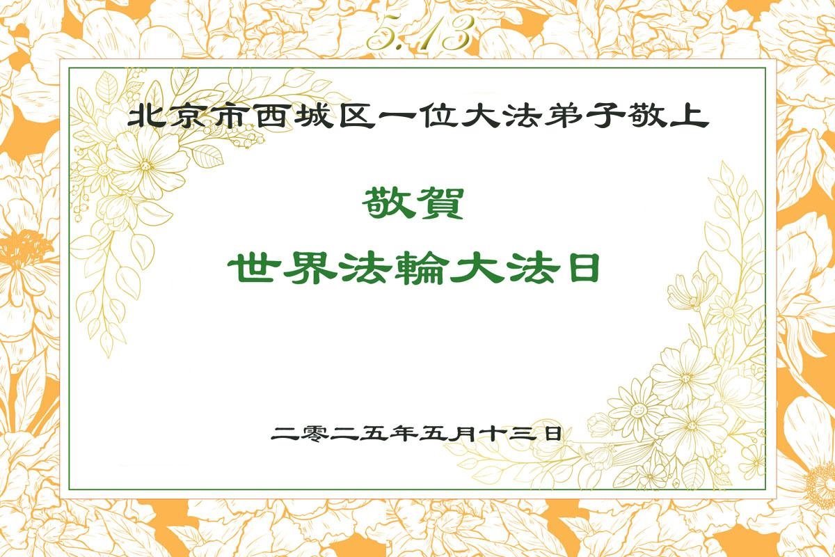 北京市西城區一位大法弟子恭賀世界法輪大法日!恭祝慈悲偉大師父生日快樂!