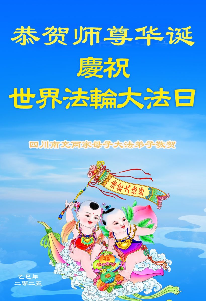 四川南充兩家母子大法弟子恭賀師尊華誕暨世界法輪大法日!