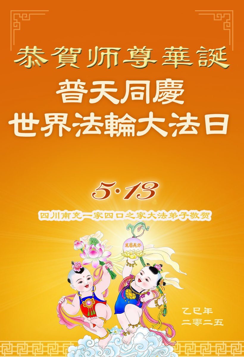 四川南充一四口之家大法弟子恭賀師尊華誕暨法輪大法日!