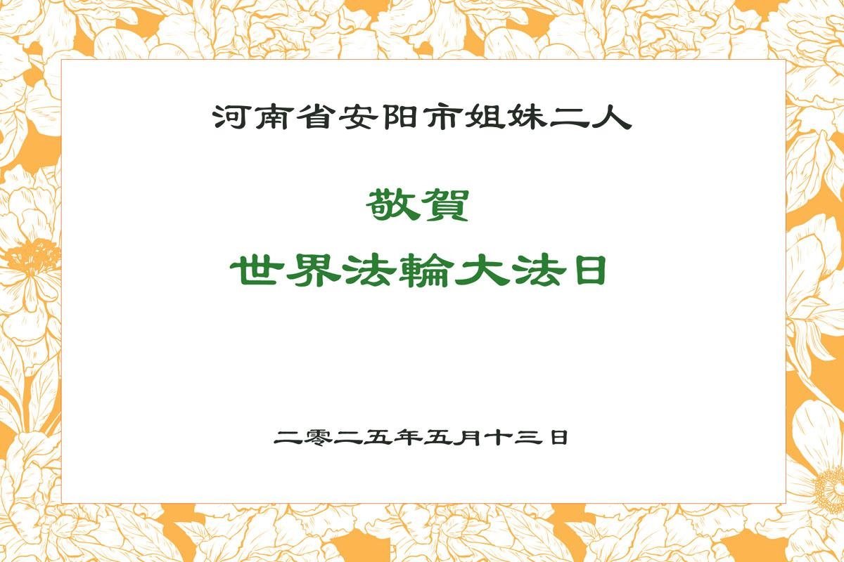 河南省安陽市姐妹二人恭祝偉大師尊生日快樂!恭賀世界法輪大法日!恭賀法輪大法洪傳33週年。