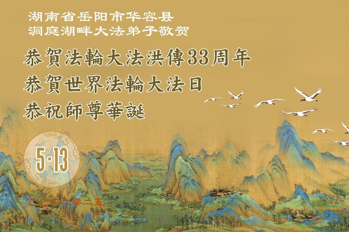 湖南省岳陽市華容縣洞庭湖畔大法弟子恭賀世界法輪大法日!