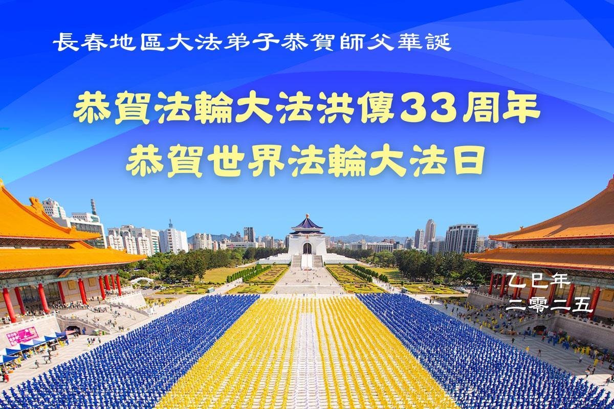 吉林省長春兩位大法弟子恭祝師尊生日快樂!恭賀世界法輪大法日!普天同慶法輪大法洪傳三十三週年!