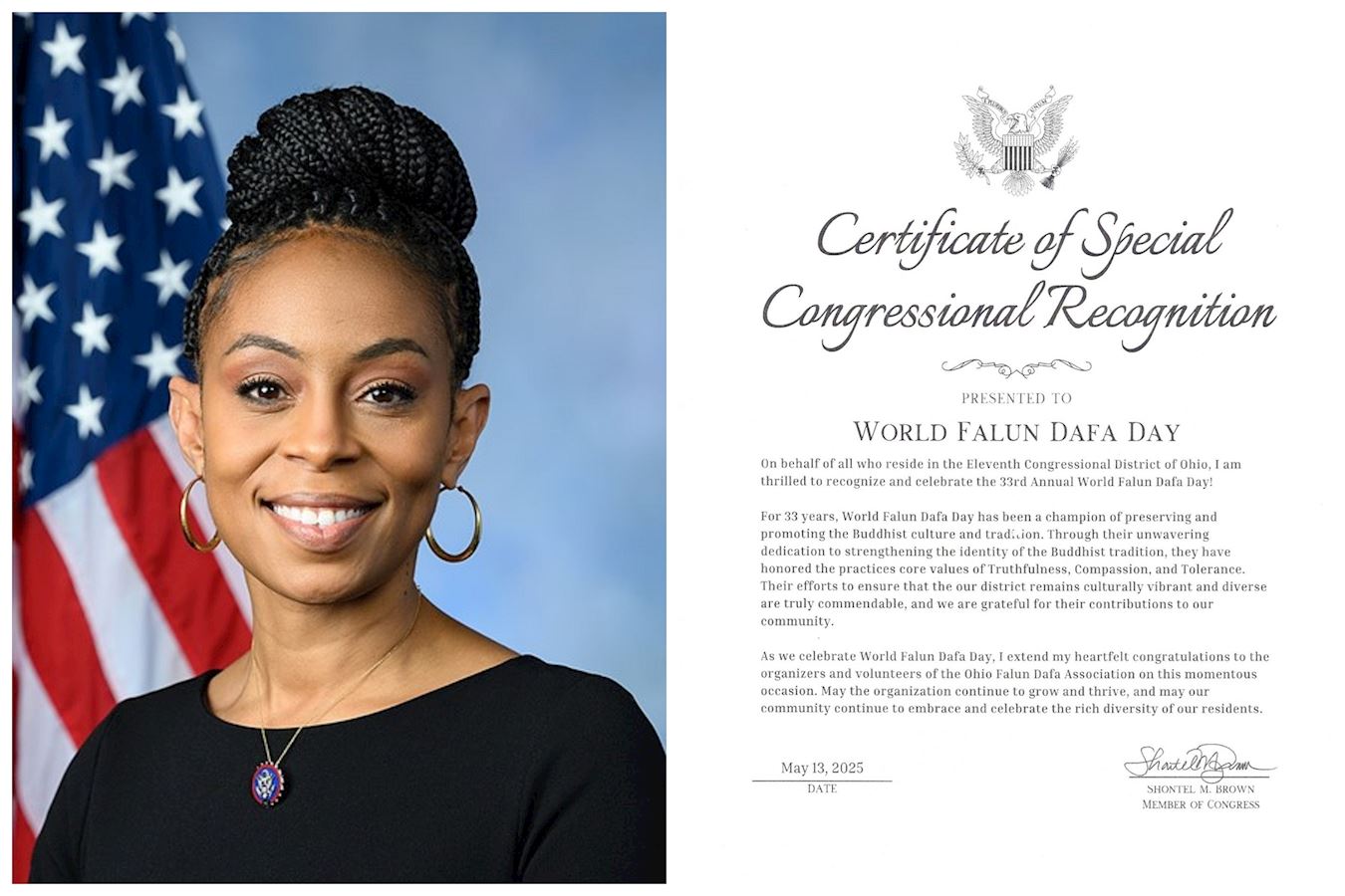 代表俄亥俄州第十一國會選區內所有居民,我非常高興地表彰並慶祝第三十三屆世界法輪大法日!