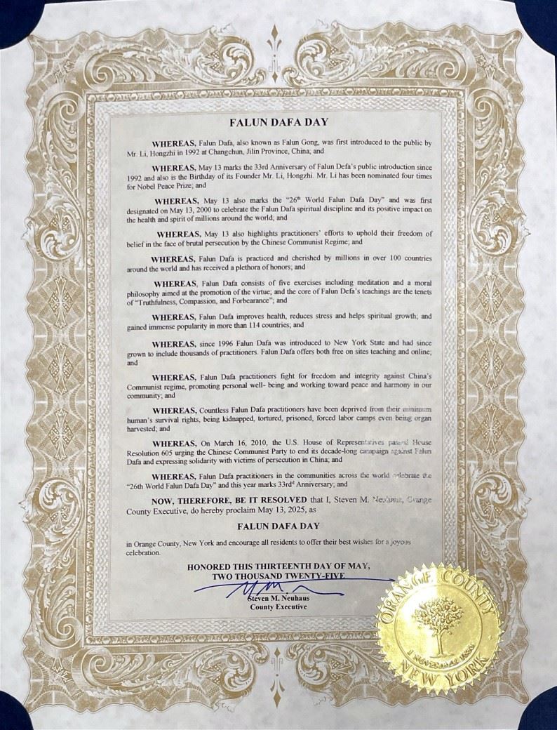 作為人口逾三百萬的橙縣縣長,紐豪斯「宣布二零二五年五月十三日為紐約橙縣法輪大法日,並鼓勵所有居民為這個喜慶日子獻上最美好的祝願」。