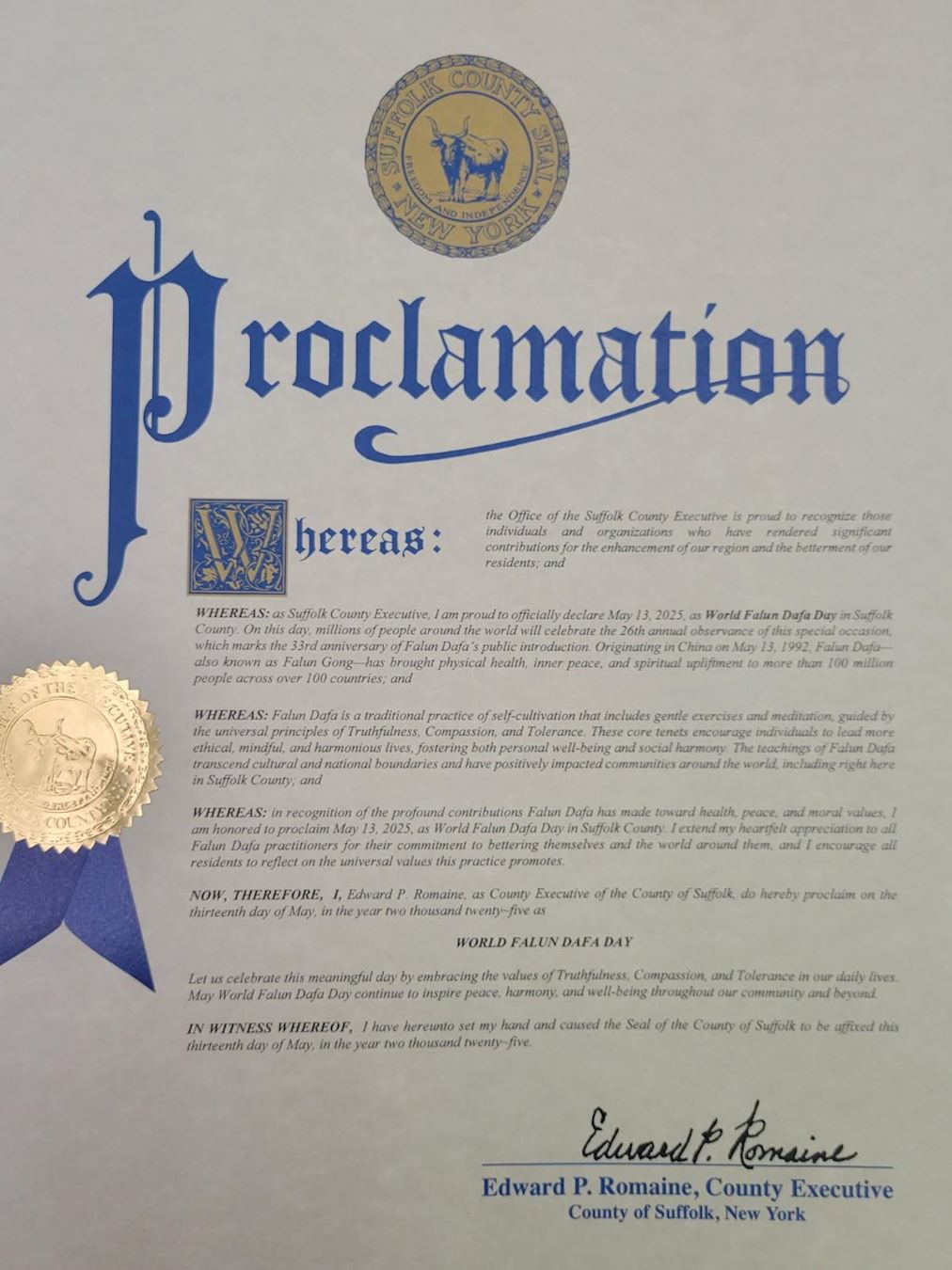 蘇福克縣縣長愛德華﹒羅梅恩(Edward P. Romaine)在褒獎公告中表示:「我榮幸地正式宣布二零二五年五月十三日為蘇福克縣的世界法輪大法日。」