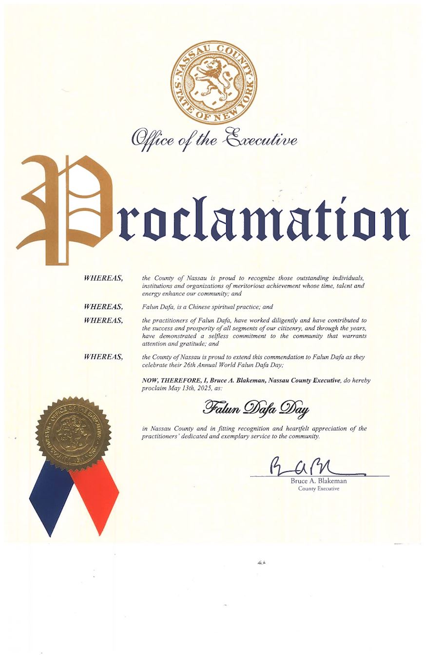 紐約州另一大縣──拿騷縣(Nassau County)縣長布魯斯﹒A﹒布萊克曼(Bruce A. Blakeman)頒發褒獎令表彰法輪大法,並宣布5月13日為該縣「法輪大法日」。